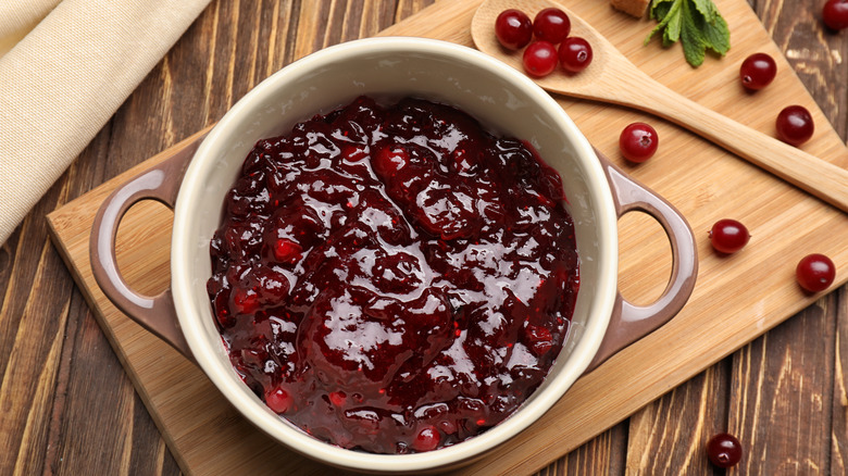 Nothing says Thanksgiving like cranberry sauce. Whether you're a straight-from-the-can guy or a DIY sweating-over-the-stove cranberry sauce gal, it's an essential part of the holidays. Cranberry sauce's mouth-puckering sweetness offers a nice alternative to the rich, heavy foods traditionally served at such meals (think turkey, gravy, and mashed potatoes) while adding a pop of color to plates that are heavy on the beige. While cranberry sauce is delicious, not everyone enjoys it, and many times, holiday hosts find themselves with excess sauce after a family and friends feast. In such a situation, it's time to whip up some of Martha Stewart's two-ingredient cranberry butter.