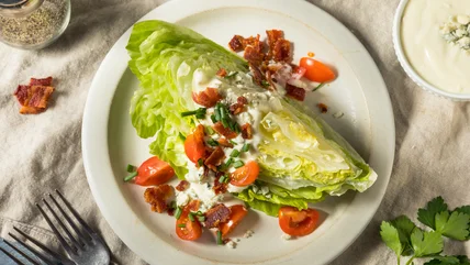 Whether you find yourself at a fancy steakhouse or at a friend's house for dinner, knowing how to eat a wedge salad with decorum is a must. Not only will learning dining dos and don'ts improve your table manners, but it'll also enhance your enjoyment. Each forkful of perfectly portioned and seasoned lettuce will guarantee a pleasing mouthful in comparison to half-dressed forkfuls void of toppings. Additionally, mastering the art of properly eating a wedge salad even leads to easier and mess-free dining, which is especially helpful since the salads tend to be served on terribly tiny plates.