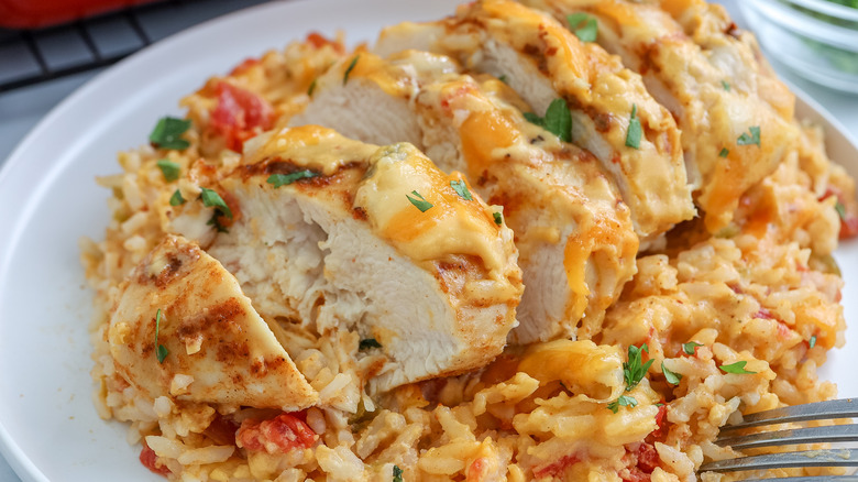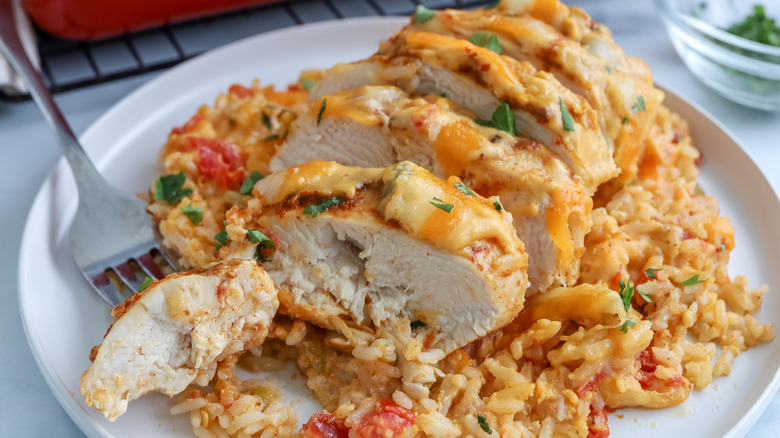 There's something so cozy and comforting about a classic chicken and rice bake — and, conveniently, it's the perfect weeknight meal because it incorporates everything you need for dinner in one casserole dish. This smothered queso chicken bake from developer Jessica Morone really amps up the flavors from a classic casserole by incorporating a bit of spice and plenty of cheesy goodness. "Tender, juicy chicken smothered in a creamy, cheesy queso sauce, all baked to perfection with fluffy rice that soaks up every bit of flavor," Morone tells us. And it is incredibly cheesy, with queso on both the rice and covering the chicken, but there is also an additional layer of shredded Mexican blend cheese melted on top.