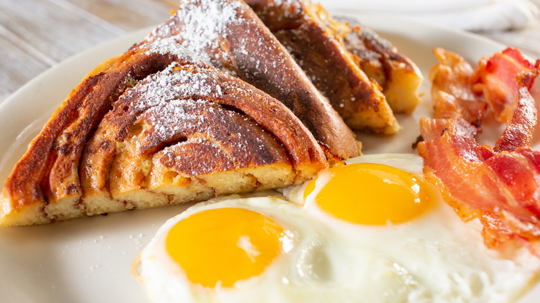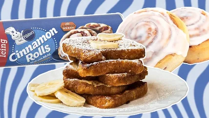 Here's what you do: Make the canned cinnamon rolls according to the instructions one day before you want to make the French toast — although feel free to enjoy some of the fresh cinnamon rolls. You want the cinnamon rolls to be a day old so that they get stale, as even minor staleness will soak up the custard mixture better. When they're a day old, slice the cinnamon rolls in half so that they're thinner, then dip into the egg custard mixture from your favorite French toast recipe — you can always refer to our milk bread French toast or even our dairy-free French toast. Finally, cook the cinnamon rolls as you would for regular French toast and enjoy. The result is a version of French toast that is sweeter, more cinnamon-y, and more memorable than a typical plate of French toast.