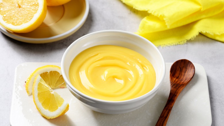 Whenever we think of lemon curd, we immediately associate it with a fine British tea party, complete with elaborate kettles and an array of baked goods. Lemon curd might give off the impression that it's quite fancy, but really, it's just a thick spread made with lemon juice, eggs, butter, and sugar. It has the consistency of custard but with the undeniable brightness of lemon. The curd is cooked over very low heat until it's perfectly thick and spreadable, allowing you to easily add it to many different recipes. And perhaps the best part about it is that while you can make it at home, you can just as easily find it in the jams and jellies section of your local grocery store.