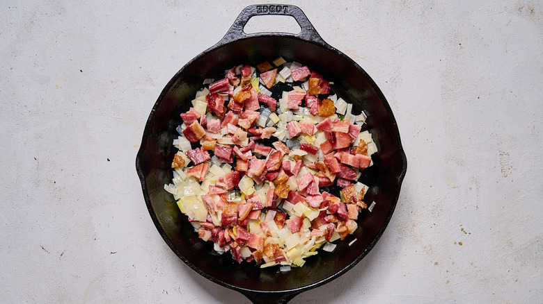 Finely chop the bacon and add it to the skillet.