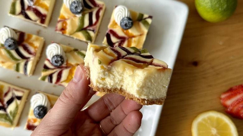 It can be surprisingly tricky to achieve that perfectly clean cut for your cheesecake bars, but there are a few tips to keep in mind that help to make it work. Arguably the most important — not just for clean slices but for the best texture for serving — is giving the cheesecake time to chill until set. After the cheesecake rests in the refrigerator for at least two hours, it will be easy to lift the bars out of the baking dish and remove the parchment paper. They'll also be firm enough to slice cleanly.