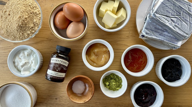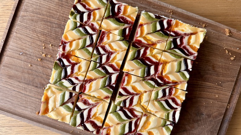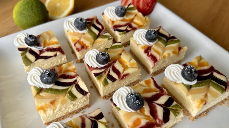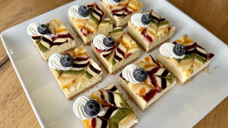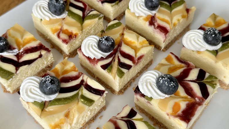 The toppings are where these cheesecake bars shine. Feel free to choose any jams or pipeable toppings you love for this purpose. Rosenhouse opted for raspberry, apricot, and blueberry jam, along with matcha green tea powder and store-bought lemon curd to represent the colors of the rainbow. Fresh blueberries placed over a rosette of fresh whipped cream add a pop of blue, but you can also achieve this by mixing some cheesecake batter with spirulina or blue butterfly pea powder for a natural blue dye.
