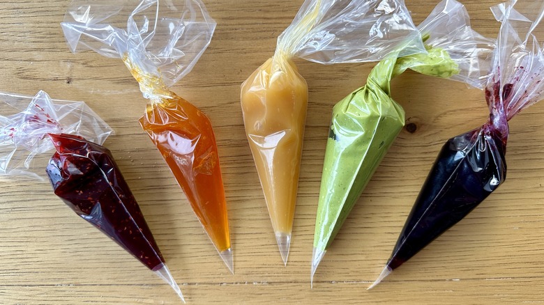 - Transfer the matcha mixture, jams, and curd each into their own piping bag or sandwich bag.