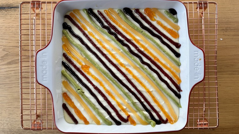 - Cut a small hole in each of the piping or sandwich bags and pipe even lines of color (in rainbow order) over the cheesecake batter.