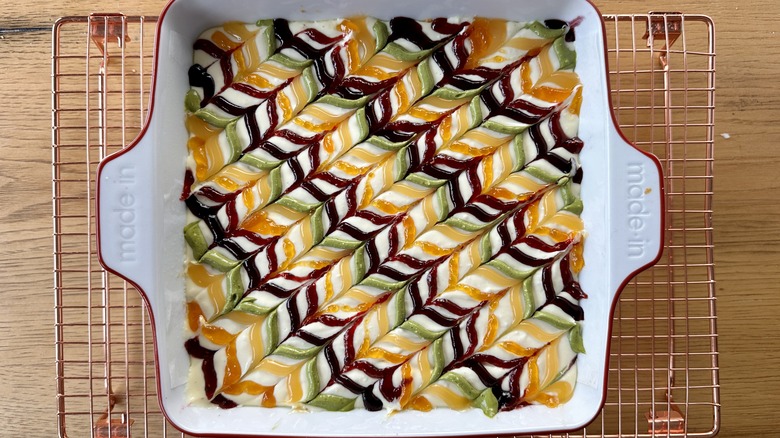 When deciding on the flavors for these naturally rainbow cheesecake bars, Rosenhouse opted for raspberry jam for red, apricot preserves for orange, store-bought lemon curd for yellow, and blueberry jam for purple. She mixed matcha green tea powder with cheesecake batter to create green, and fresh blueberries took care of the blue. With this idea in mind, you can choose any flavors of jam or toppings you love to create your swirl pattern. For vibrant options, strawberry, cherry, or blackberry jam, orange marmalade, grape jelly, or lime curd would all work well.