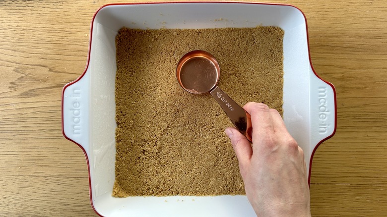 - Pour into the prepared baking dish and press evenly to coat the bottom (use a small measuring cup to press for perfectly even results).
