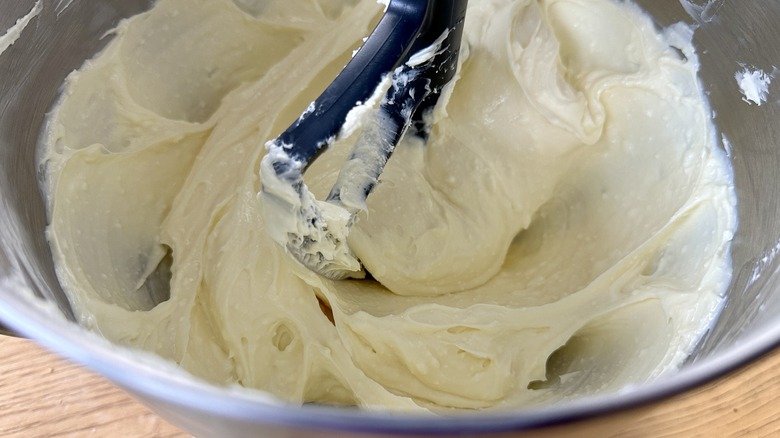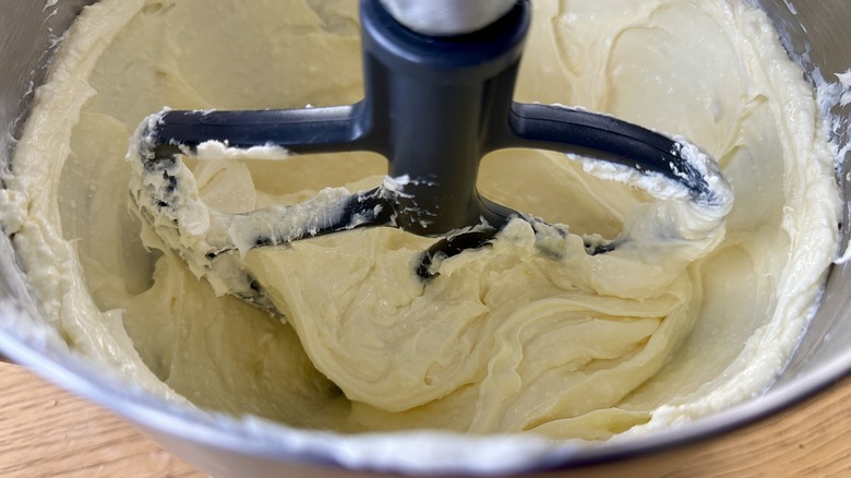 - Add the eggs one at a time, beating to combine until smooth after each addition. Scrape down with a rubber spatula as needed to ensure a smooth mix.