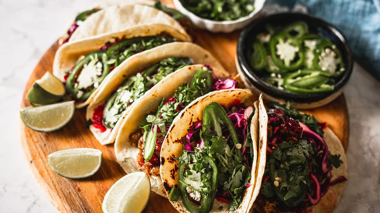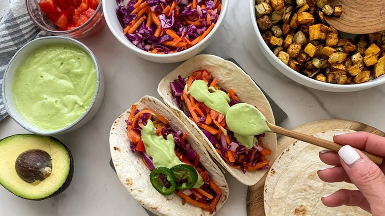 If you were looking at the duck confit tacos recipe and wishing there was a heavier focus on veggies, this recipe substitutes in the meaty flavors of roasted rutabaga and eggplant. The recipe is pretty simple seeing as the bulk of the cooking involves chopping up the veggies and placing them in the oven. Tacos are all about flavor and, while baked veggies are delicious, they aren't quite able to achieve the full-bodied taste we're looking for. That's why these tacos come topped with some cilantro lime crema for a rich mouthfeel and taste.