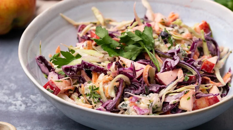 Here's another slaw dish for you. This one stands out by placing kale at the forefront with red cabbage acting in a supporting role. Kale's texture can sometimes be too dense and fibrous for raw dishes like this, but there are tips you can follow when cooking with kale that will soften it up, like removing the stem and massaging the leaves. The apple cider vinegar in this recipe will also work to soften up the kale, elevating this slaw above and beyond. It's plenty healthy and comes together in a flash.