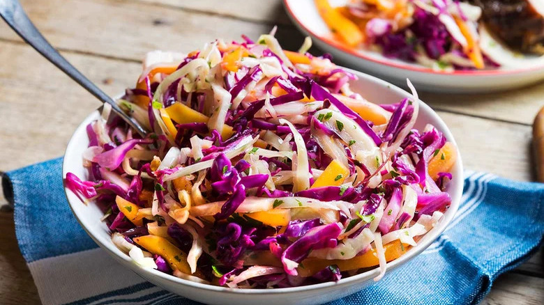 Red cabbage doesn't often stand center stage in the kitchen, but that only makes it all the more versatile of an ingredient. As you'll quickly discover from this list, red cabbage is most commonly used as a slaw or in salads and is more commonly associated with Asian dishes — though it's far from exclusive.