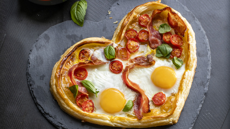 When it comes to toppings, you can crack your eggs right on the pizza and bake for up to 15 minutes at 450 degrees Fahrenheit if you want them runny, or partially scramble them separately first. Incorporate some chorizo, salsa, cotija, and lime juice for a Mexican breakfast pizza; bacon (or sausage), hash browns, and shredded cheddar for a classic flavor profile; or tomatoes, mushrooms, spinach, and bell peppers to pack on the veggies. If you're in a more saccharine mood, make a sweet version with fruit, cinnamon, and chopped nuts. You may find that your pizza will be harder to share than you thought.