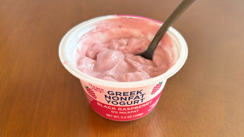 It's pretty hard to mess up strawberry yogurt, and fortunately, Trader Joe's strawberry-flavored Greek yogurt is perfectly tasty — tasty enough to break into this list's top 10, in fact. Something that stuck out to me about this yogurt was its thickness; some flavored Greek yogurts become a bit watery, but this one stayed nice and thick all while retaining a smooth strawberry flavor, too.