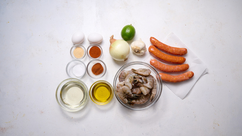 The first things you'll need to grab are the ingredients to marinate the shrimp. You'll need olive oil, chili powder, paprika, garlic powder, salt, lime juice, and jumbo shrimp. Jumbo shrimp are great for grilling because they cook well over high heat, and you'll need to use the largest size possible if you want to wrap the shrimp around the chorizo like we do here. If you're using smaller shrimp, simply skewer the shrimp separately from the chorizo, forgoing the fancy skewering techniques. For the chorizo, you'll want to look for links that are in casing, but not cured — you want Mexican chorizo that is firm enough to be cut into pieces. From there, you'll need onion, garlic, a whole egg, an egg yolk, a neutral oil like vegetable oil, and the zest from the lime that you are juicing.