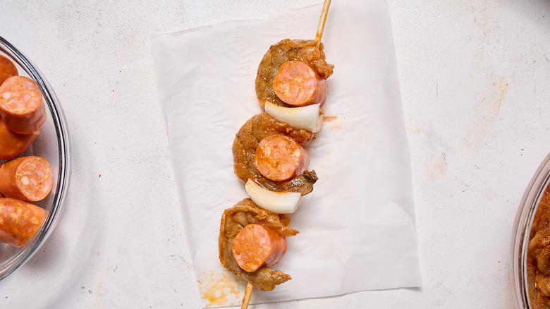 There's no better reason to fire up the grill than for loaded-up skewers. The calling card of the summer, wooden skewers stacked high with meat and veggies are a staple for any grill master, and they're always good to have on hand for quick and easy dinners. This recipe, written with developer Michelle McGlinn, features jumbo shrimp wrapped around spicy rounds of chorizo that speared together with juicy, charred onions.