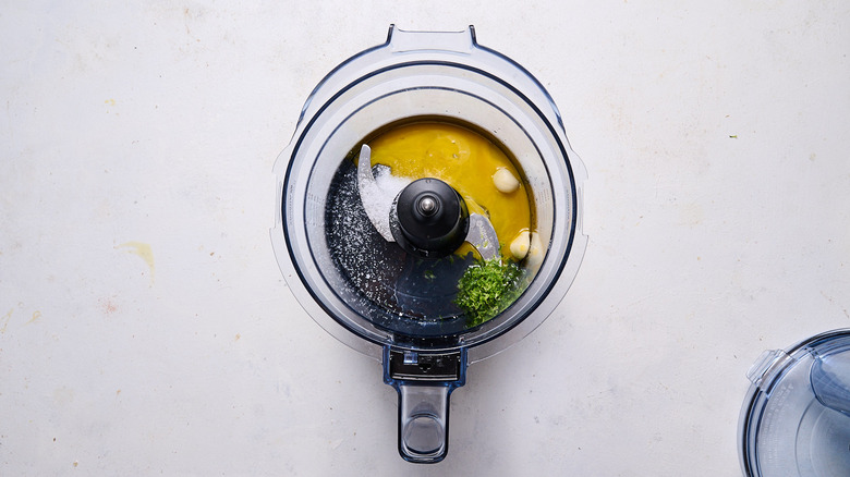 It's also possible that there isn't enough egg to form an emulsification at all. Don't worry: The aioli can still be saved. Pour the thin mixture into a measuring cup and rinse out the food processor. Add a whole egg. Put the lid onto the blender and slowly drizzle the thinned oil mixture into the egg while pulsing. About halfway through, your mixture should start becoming opaque, and with a few more seconds, it should thicken. You may not use all of the oil in this second try — you'll want to stop blending once the aioli is the consistency of mayonnaise. If all else fails, of course, you can just add lime juice, salt, and garlic to some mayo.