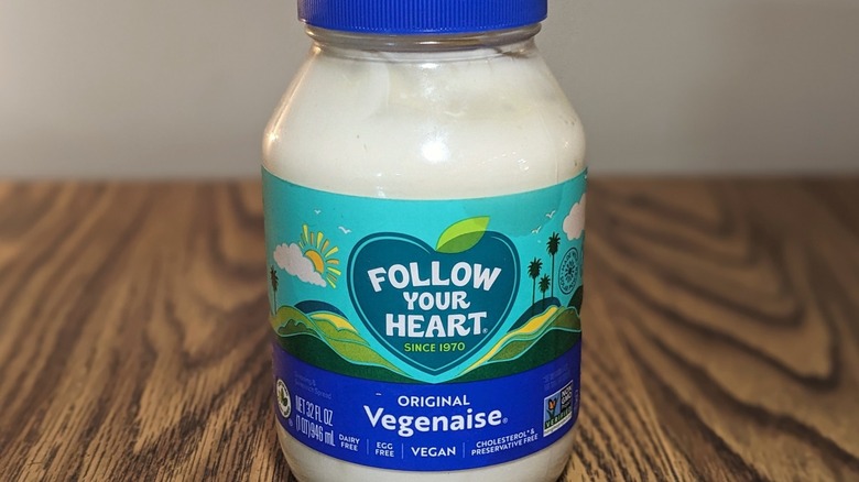 Vegenaise doesn't try to replicate regular mayonnaise the way other options on this list do. It's incredibly creamy and indulgent; spreading it on a slice of sandwich bread is a sacred experience. Vegenaise's unique flavor is citrusy and aromatic, with hints of savory garlic and sweet apple. Follow Your Heart's signature product manages to be both flavorful and versatile, earning it the number one spot in this plant-based mayo roundup.