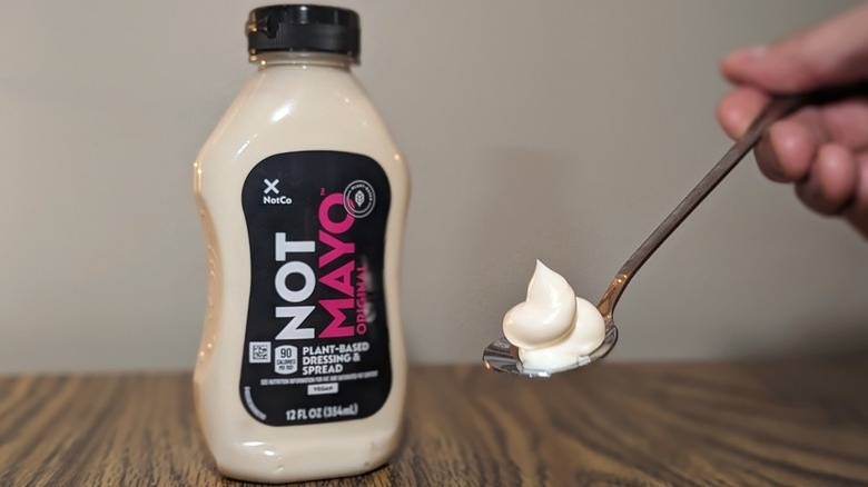 NotCo is a Chilean company specializing in plant-based foods. The company offers vegan versions of milk, plant-based meats, and — of course — vegan mayonnaise. NotCo's NotMayo has gained notoriety in the United States in recent years, and I was excited to see what all the buzz is about. For starters, I appreciate that NotMayo comes in a no-mess squeeze bottle instead of the usual jar. I was able to effortlessly squeeze a generous helping onto a sandwich and immediately noticed its dense and velvety texture.