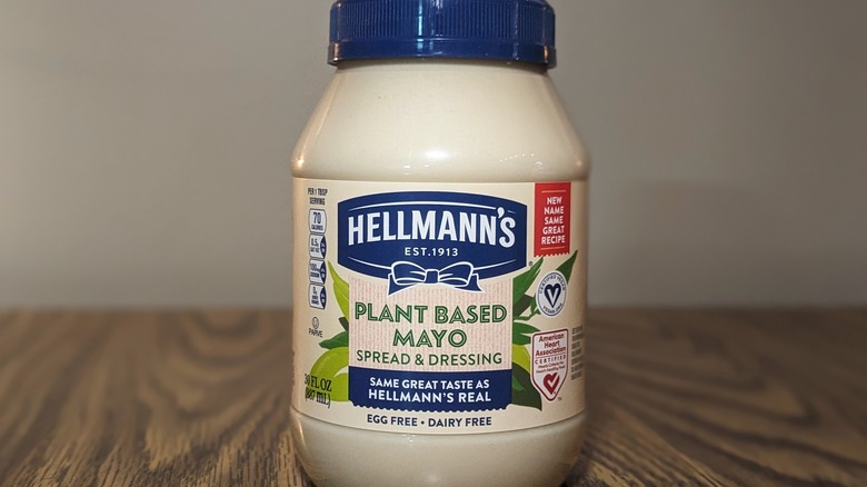 Flavor-wise, Hellmann's real mayo and the company's vegan version are almost identical. But, the vegan spread lacks the eggy aftertaste that makes Hellman's mayo so iconic. Moreover, Hellmann's traditional mayo is also known for its noticeably bouncy texture. While the vegan mayo isn't runny, I would be hard-pressed to refer to it as bouncy. It's incredibly smooth and luscious and not nearly as gelatinous as the real thing, which is likely preferable for some consumers.