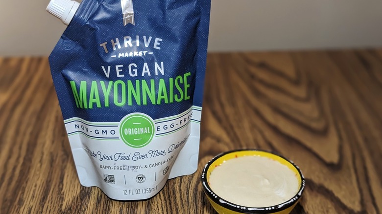 When I received Thrive Market's vegan mayonnaise, I was shocked to discover that it came in a squeezable bag with a spout and screw top. I assumed that, in order to package the mayo this way, it must be very watery. Unfortunately, my assumption was correct. Not only was this — dare I call it — "mayo" extremely runny, but the yellow-green color was as off-putting as you could imagine. To add to its unpleasant texture and color, Thrive Market's mayo is exceptionally sour. Some degree of tanginess is always expected in mayo, but this company took it too far. Its liquidy texture and bitter taste landed this product in the dead-last position on this list. If you ever have the misfortune of fumbling to squeeze this product onto a sandwich, be prepared for a stream of mayo-like goop to come gushing out, drowning your meal in a sour, pungent, and runny mess. This mayo could potentially act as a creamy addition to soups, but be prepared for a burst of vinegar flavor.