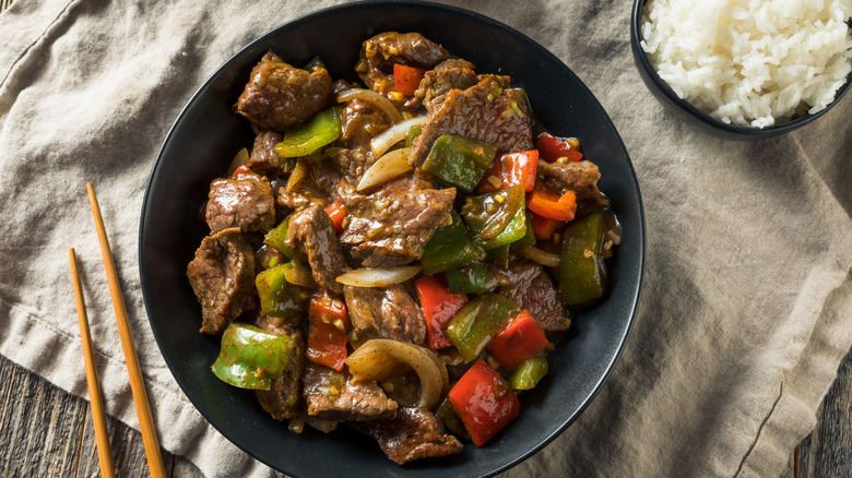 Freezing your stir-fry beef for 30 minutes can make it easier to cut it into super-thin slices. However, if you don't have time to freeze your flank steak, you can flatten it with a mallet or rolling pin to tenderize the connective tissues in the meat before slicing it against the grain. Coating your protein in cornstarch and baking soda before stir-frying them is another useful move to tenderize the fibers. Once you've mastered all these tips and techniques for the perfect stir fry, you'll soon be recreating restaurant-style dishes at home that are lusciously tender and light, such as spicy sesame beef and beef in black bean sauce.