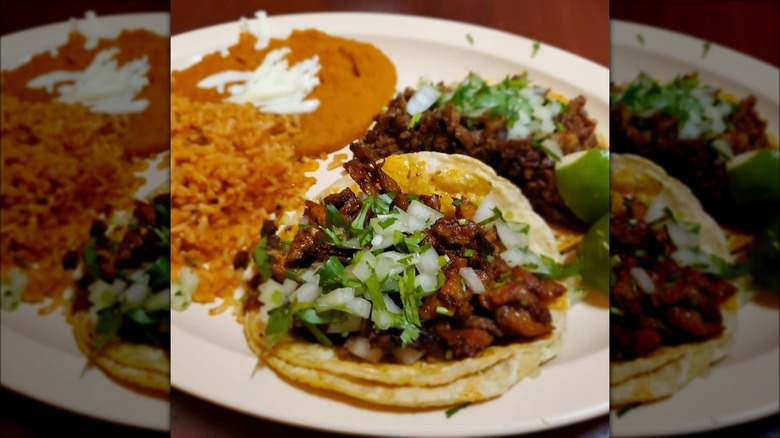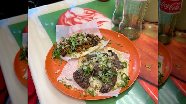 Located on the North Side of Chicago, this family-run restaurant began serving tacos in 1993. Orange-tiled walls and bright orange booths may date this taqueria. Still, over the years, it's continued to produce consistently delicious tacos. You'll find all the mainstays, including chicken, al pastor, and barbacoa de res, served as tortas, tacos, or burritos — but true to its name, it's the carne asada taco you're after. Long strips of skirt steak are placed on the grill continuously throughout the day; no sandbagging here, a kitchen hack whereby the meat is chopped and left to overcook, only to be reheated later.