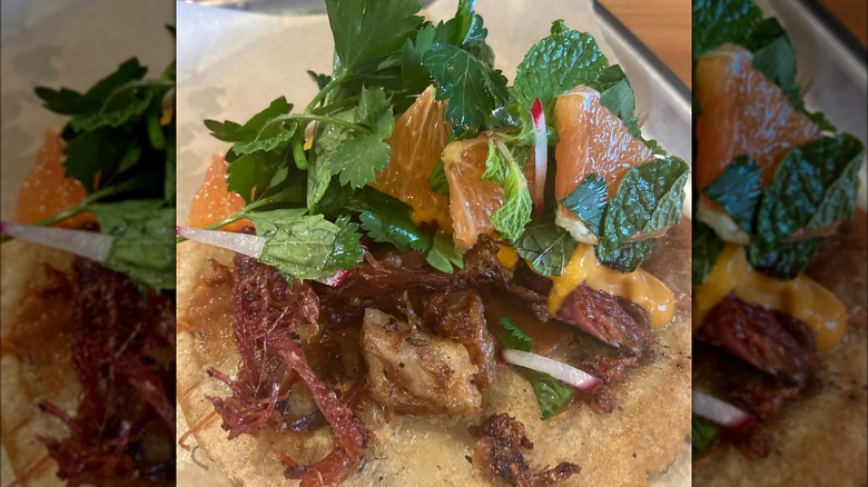 One such extravagance is the mainstay duck carnitas taco. Carnitas are typically made with pork, but Taqueria Chingón opts for fatty, succulent poultry. To make the taco, hand-pressed masa dough is topped with crispy duck and fried duck skin for texture. A slick of date puree balances the salty aspects, and an astringent orange, radish, and herb salad cuts through the fat, while a sunchoke-habanero salsa complements the whole dish.