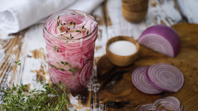 Pickling onions requires a few standard ingredients: red onion, vinegar, sugar, salt, and water (but you can opt for a sugar-free version if you want to). You can also include other ingredients for more flavor nuances if you'd like, like ginger, shallots, garlic cloves, mustard seeds, etc. Switching up regular vinegar with apple cider vinegar is also an option, especially if you like a more pronounced tart undertone. It's a two-step process of heating everything (except the onions) until the sugar and salt completely dissolve. Once the liquid has cooled down, pour it over the onion and store it in the fridge for one to three hours before using, but you can keep it for up to three weeks.