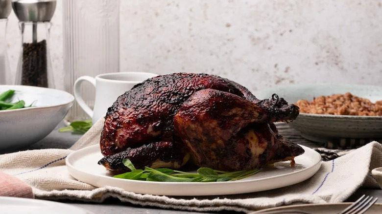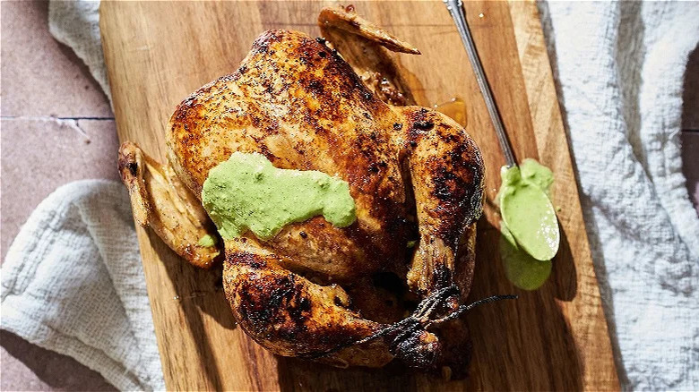 This dish is popular all over Peru, but with this recipe, your guests can enjoy it wherever you are. After you serve whole-roasted Peruvian-style chicken, there's no way they'll think of the bird as bland ever again. Just a few of this recipe's flavor-packed ingredients include lime juice, cumin, soy sauce, honey, cilantro, apple cider vinegar, jalapeño, and aji amarillo paste — the latter of which is made from the fiery aji amarillo pepper, which is up to 10 times spicier than a jalapeño. Once you marinate and roast your poultry, you'll top it with a creamy aji verde sauce, which uses Greek yogurt to counteract the spice.