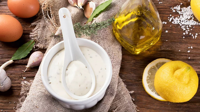 Aioli is one of the best ingredients to elevate egg salad because it's similar in texture to mayo. Aioli is an oil emulsion like mayo but usually uses olive oil and garlic, which gives it a deeper flavor. This makes it an easy substitute that gives your egg salad an extra punch. Garlic is an underrated pairing for eggs and gives the rich, fatty food an extra kick. You can easily make your own or get a good quality store-bought aioli and watch your egg salad instantly go from classic to impressive.