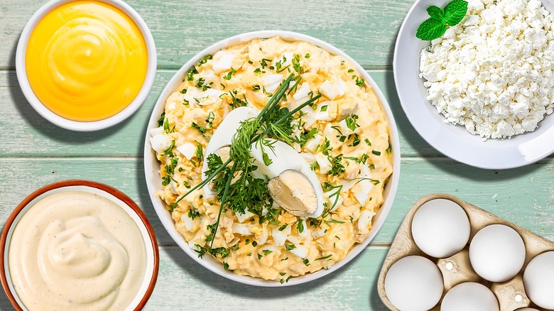 There are ways to enjoy egg salad, even if you avoid mayonnaise. For example, you can use cottage cheese instead of mayo in your egg salad. This cheese is a great substitute for mayo because it's just as creamy, higher in protein, and offers a lighter touch to your salad. Use chunky cottage cheese if you prefer a very textured egg salad, or scoop in smooth cottage cheese for a silkier texture that will allow the eggs to shine.