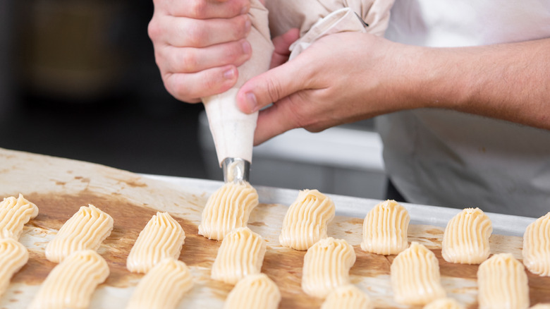 While this alternative method won't produce the ridged pattern, it still results in unique, well-defined cheese straws that are easy to handle and perfect for any occasion. Begin by dusting your clean and dry countertop surface with flour. Place the dough on the surface and roll it out to form a rectangle about 1/16 inch thick. Using a pizza cutter, pastry cutter, or a sharp knife, cut the dough into identical strips — a width of ¾ inch and a length of 6 inches will do. As you place each strip on a parchment-lined baking sheet, you can twist them a few times for a fun design. Now your cheese straws are ready to bake. However, if you're still bent on creating the familiar ribbed pattern, here's how to use a pastry bag in place of a cookie press.