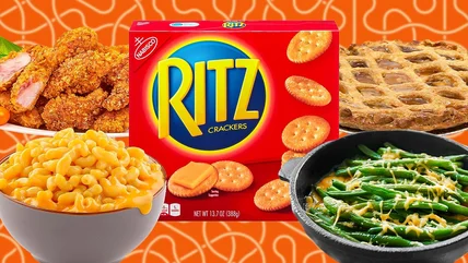 Green bean casserole is an American holiday classic; cans of cream of mushroom soup and green beans combine in the oven to make something comforting and delicious. Green bean casserole is traditionally topped with crispy fried onions or shallots before baking. Crispy alliums make an excellent topping for the dish because they add a much-needed crunch to an otherwise soggy (though delicious) bake. But crushed Ritz crackers will achieve the same effect and can be pulled from the pantry like the rest of the classic casserole ingredients.