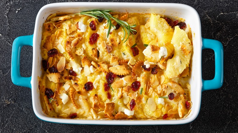 Like many classic homestyle casseroles, it makes use of pantry staples to create deliciously indulgent results. Canned pineapple is mixed with cheddar cheese, a familiar combination to any defender of Hawaiian pizza. Then sugar, flour, and butter are folded in. The mixture is then topped with Ritz crackers before it goes into the oven, ensuring a crumbly and crispy layer on top.