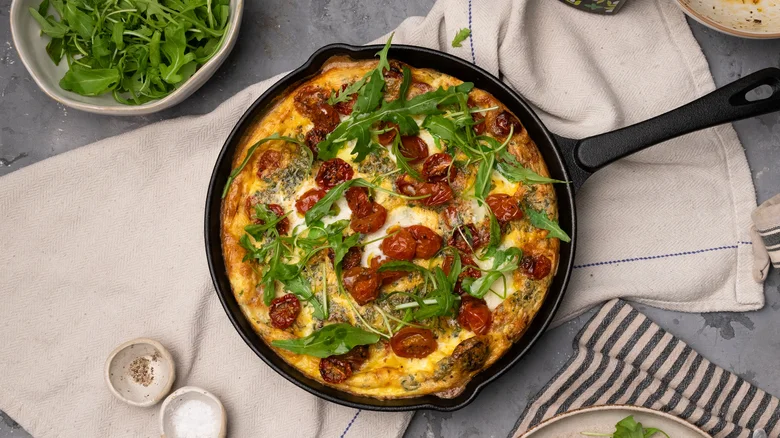 While our first frittata on the list had the cherry tomatoes on the outside, this version incorporates them into the mix. First, though, they get roasted with whole garlic cloves to accentuate their flavor. Then the tomatoes, as well as fresh basil, are added to an egg and cream mixture along with fresh, melty mozzarella. Next, bake until the frittata is golden brown all around and just set in the center. You don't need any sort of sauce with so much moisture and flavor within, but a sprinkling of peppery arugula on top sets this egg pie off right.