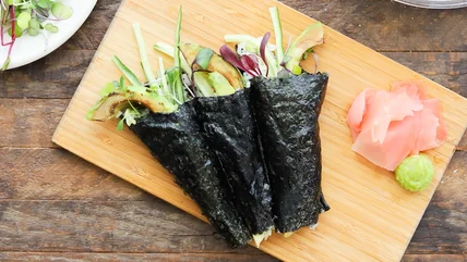 Homemade sushi hand rolls should be the newest addition to your weekly lunches. These charred avocado hand rolls from Tasting Table recipe developer Taylor Murray make the process of enjoying homemade sushi a breeze. She adds a smoky flavor element to the mix by charring the avocado. Cooked avocado might sound off-putting to some people, but don't knock this flavor hack 'til you try it. Charring is a great way to infuse more flavor into relatively simple ingredients. The creamy avocado is a great candidate for charring because the soft texture and slightly sweet flavor contrast against the bitter smokiness from the flame.