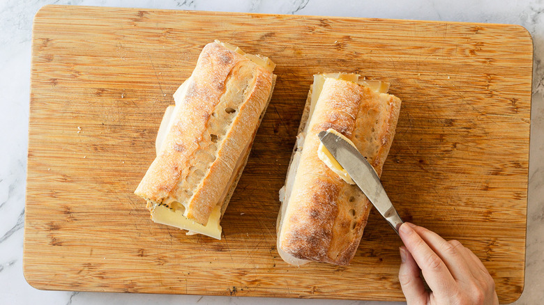 - Cut the ciabatta in half through the middle.