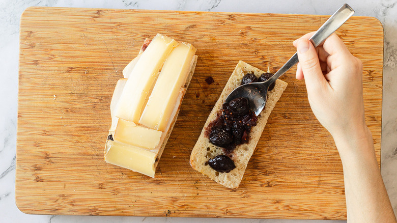 - On the bottom half of each slice, layer ¼ cup cherry chutney, then add smoked turkey and Gruyère cheese slices.