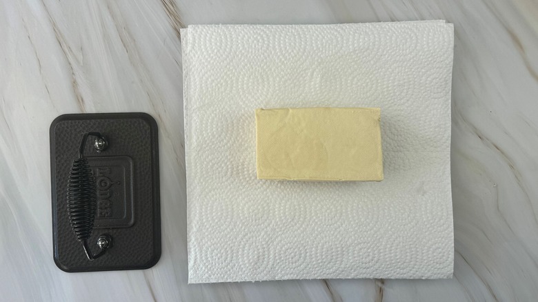 Wrap the tofu in a paper towel and place it on a cutting board.