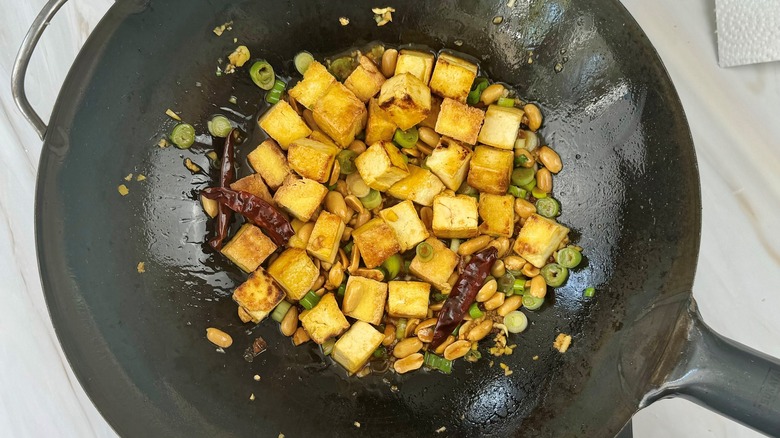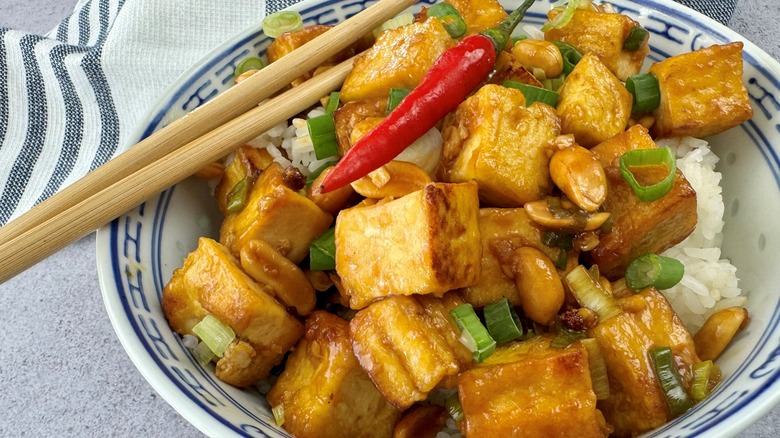 Kung pao chicken, a stir-fried dish in a tangy-sweet sauce with a serious kick from chiles and Sichuan peppercorns, has an origin story that dates back to the 19th century. While the original kung pao dish is made with chicken, this enduring Chinese takeout favorite has spawned numerous knockoffs over the years including kung pao shrimp, kung pao scallops, and meat-free versions like kung pao cauliflower and kung pao tofu. As recipe developer Julianne De Witt says of her take on kung pao tofu, "It's a flavorful, easy recipe that makes a perfect weeknight meal." Serve it with rice as she does here, or try it with noodles or even rolled into lettuce to make low-carb wraps. This is a great dish for solo diners, too, since it lasts for up to 4 days in the refrigerator.