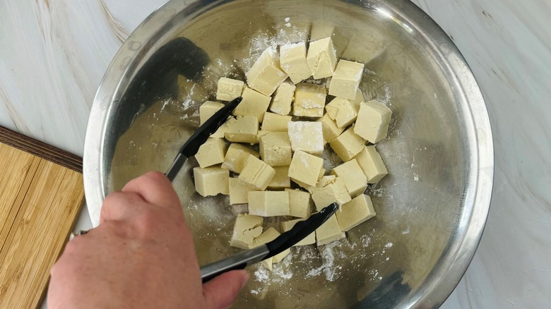 - Cut the tofu into 1-inch cubes.