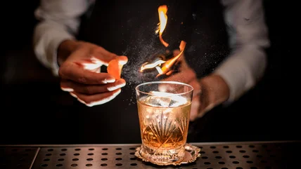 The biggest challenge for any home bartender attempting to smoke their drinks is knowing how long they should keep the glass in contact with the smoke. In small quantities, a smoky flavor can work wonders in both food and drinks alike — but if you add too much, you end up with something that tastes more burnt than brilliant. You shouldn't need longer than a minute, though your mileage may vary. Express an orange peel over the drink by pinching it between your fingers with the outside facing toward the drink. This breaks open the skin, allowing bright citrus oils to spray over the drink and create a sweet, fruity aroma. Then, artfully place the orange peel onto the glass and enjoy.