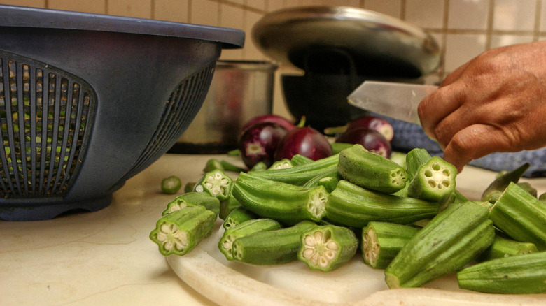 Before you set out to make shrimp and okra gumbo or throw cut slices into your air fryer, you may want to take a breath after you've washed the ingredient to use. Dry pieces of okra can yield crisper bites when seared or fried. Whether you plan in advance and let the pieces air dry on your counter or use a paper towel to blot excess moisture, this subtle move can make a major difference in the overall texture of your finished okra dishes. While other vegetables can be plopped into a hot pan without much thought, okra is a different kind of challenge for those adverse to mucus-like foods.