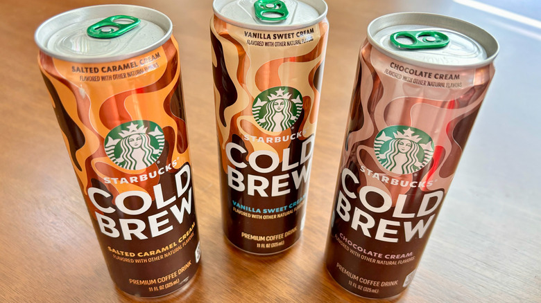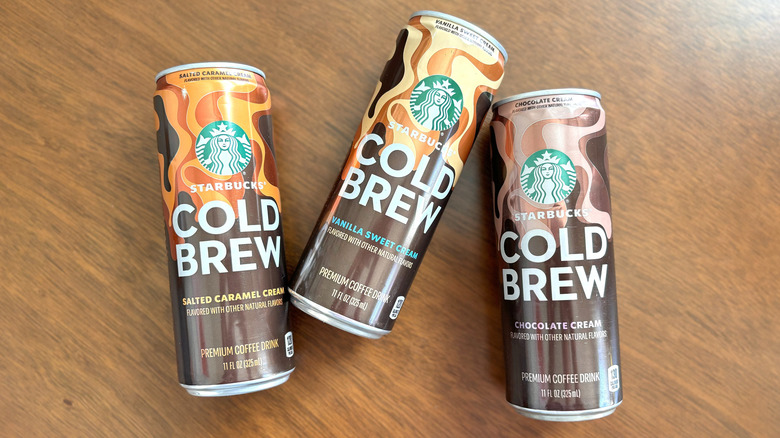 The new Starbucks canned cold brew flavors might sound quite familiar if you're a regular cold brew drinker — that's because they all directly mimic "fan-favorite" flavors that Starbucks offers in actual storefronts. Vanilla Sweet Cream, Chocolate Cream, and Salted Caramel Cream are in the canned cold brew lineup, though they are notably much different than what you might purchase at a cafe. For starters, the chocolate and caramel cold brews at Starbucks stores feature a plain cold brew base, a few pumps of vanilla, and an infused cold foam on top. The vanilla one, meanwhile, features the same cold brew base and vanilla flavoring but gets a splash of vanilla sweet cream instead of a cold foam.