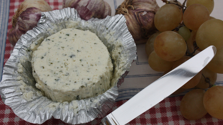 The texture of this unique cheese product is a little bit firmer than cream cheese, but it's otherwise super buttery and takes on the profile of whatever seasonings it's mixed with. In the case of Boursin, you'll get a magical blend of garlic, white pepper, chives, and parsley. It's a perfect cheese to use for your omelet when you don't want to undergo the laborious task of cutting and adding these herbs to your omelet separately. Crumble the cheese on top of your omelet before the final fold to get the delicious flavor of this spread with every bite.