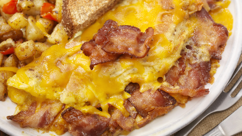 Although omelets may require a bit more time and finesse than a plate of scrambled eggs, they're totally worth it. This breakfast dish is super customizable and easy to tweak to fit your palate — and whatever ingredients you have in your refrigerator. You can go with a Denver omelet featuring the classic trio of onions, green pepper, and ham, or you can get creative and add oysters to your omelet for a straight-from-the-sea flavor. Though as delicious as these additions sound, the best omelet filling is undoubtedly cheese.