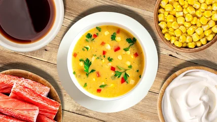 If you prefer fish, choose a variety with a firm texture; this will ensure it doesn't fall apart in the soup. Tasty options include cod, pollack, or ocean perch. If you prefer seafood, go for chunks of crab meat, peeled shrimp, clams, or scallops. For a crab and corn chowder soup, feel free to use canned or fresh crab meat, depending on what you can find.