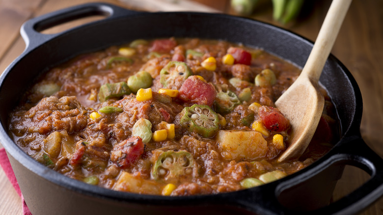 We may never know who invented this dish for sure, but either way, it's a popular part of Georgia's modern-day dining scene, especially at barbecue restaurants. These days, it's often made with leftover barbecued meat and okra, but its history of containing whatever vegetables you have on hand has been preserved — corn and lima beans are popular options. The Brunswick stew recipe may even be spiked with barbecue sauce.