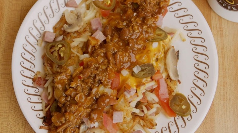 These are just a few of the ways you can mix and match hash brown styles to your heart's content at Waffle House — but if you want to go wild, order them "all the way," which means adding onions, cheese, ham, jalapeños, tomatoes, mushrooms, chili, and gravy. Only at Waffle House can you get such a filling meal just by ordering hash browns.